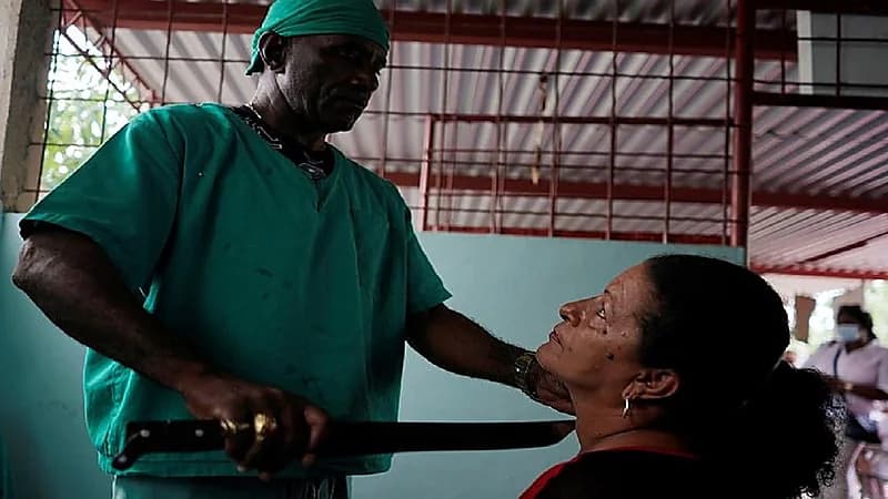 في واقعة غريبة ، يمارس معالج روحي في كوبا نشاطه مستخدماً ساطوره في العمليات الجراحية .