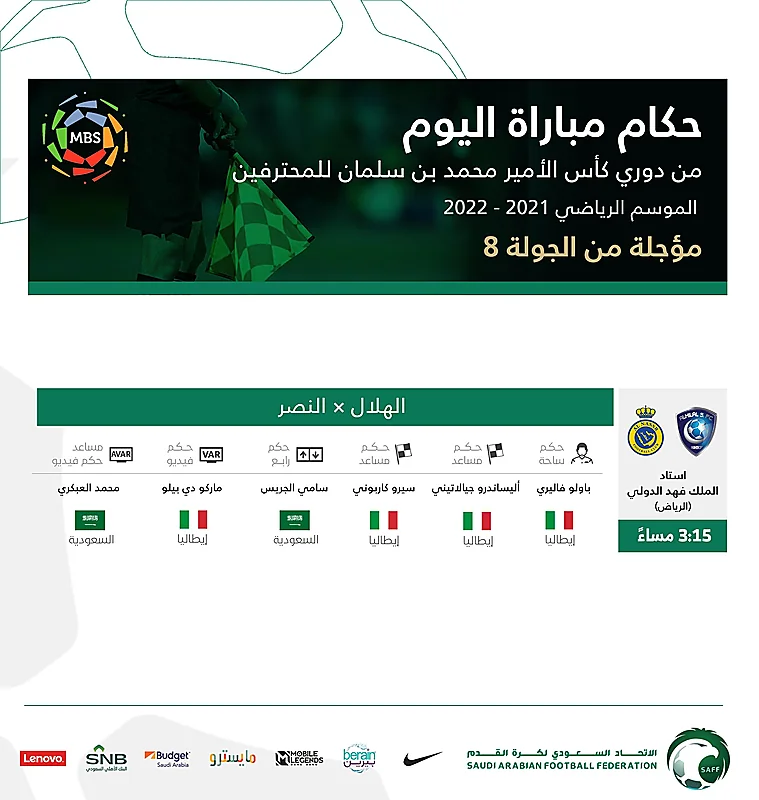 وأوضح اتحاد الكرة، أن الإيطالي باولو فاليري هو حكم الساحة بالمباراة المقامة على استاد الملك فهد الدولي، بينما الإيطالي أليساندرو جيالاتيني، وسيرو كاربوني هما حكمين مساعدين، وسامي الجريس هو الحكم الرابع، وماركو دي بيلو حكم الفيديو، ومحمد العبكري مساعده.