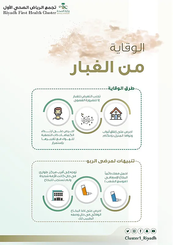 ونصح " التجمع الأول " الجميع بعدم التعرض للغبار وإحكام إغلاق الأبواب والنوافذ وعدم مغادرة المنزل بالنسبة لمرضى الربو والجهاز التنفسي في مثل هذه الأجواء إلاّ للضرورة، واتباع إرشادات الطبيب بدقة واستخدام الأدوية المناسبة .