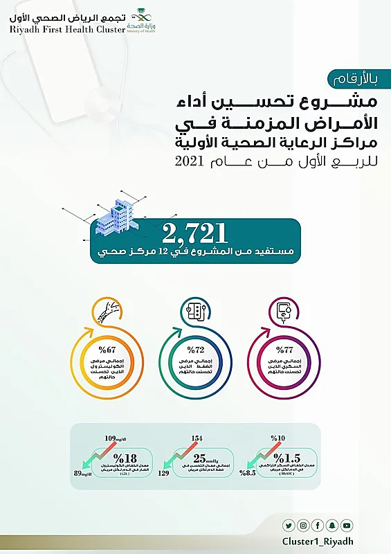 أطلق تجمع الرياض الصحي الأول مشروع تحسين أداء الأمراض المزمنة للحد من انتشارها ومعالجتها والتقليل من مضاعفاتها؛ ويقوم البرنامج على مبدأ الرعاية الوقائية والعلاجية والتوعوية لأصحاب الأمراض المزمنة.
