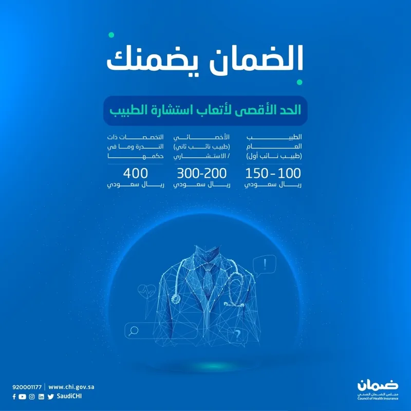 حدد مجلس الضمان الصحي الحد الأقصى لتكاليف الاستشارات الطبية، فالطبيب العام تتراوح من 100 ريال إلى 150.