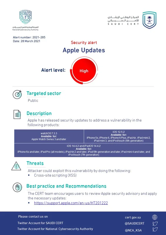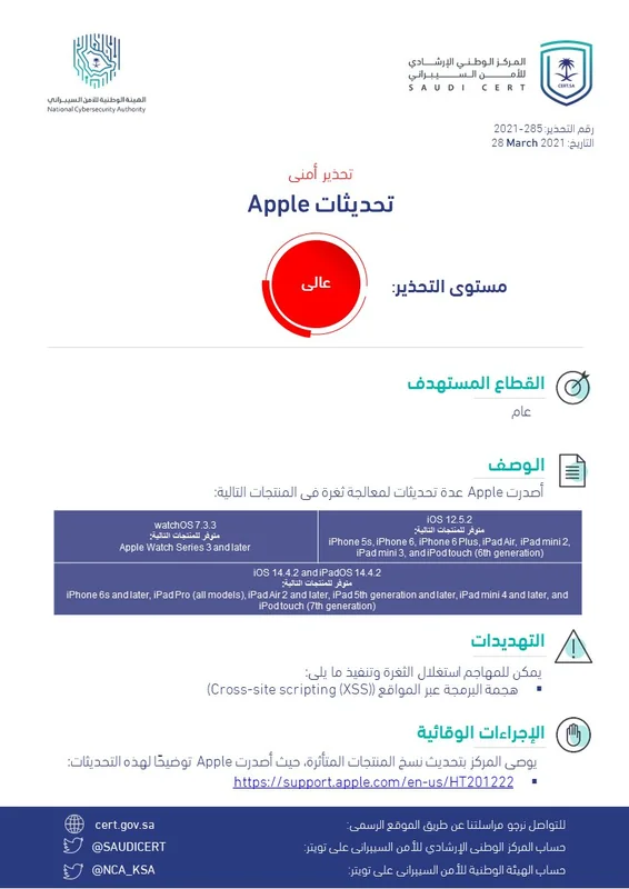 كشف المركز الوطني للأمن السيبراني، اليوم الأحد، عن تحذير أمني عالي الخطورة فيما يخص بعض منتجات شركة Apple حيث أصدرت الشركة عدة تحديثات لمعالجة ثغرة في المنتجات.