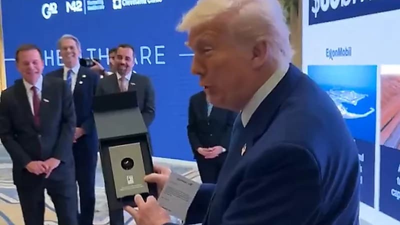 ترامب يتسلم قطرة صغيرة من النفط محفوظة كتذكار هدية من الامارات.. فيديو