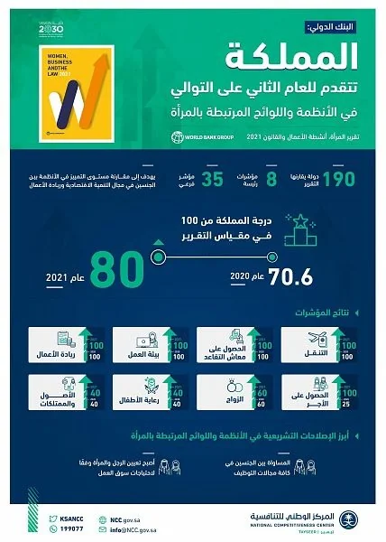 حقّقت المملكة، تقدُّمًا جديدًا للعام الثاني على التوالي في تقرير "المرأة، أنشطة الأعمال والقانون 2021" الصادر عن مجموعة البنك الدولي، الذي يهدف إلى مُقارنة مستوى التمييز في الأنظمة بين الجنسين في مجال التنمية الاقتصادية وريادة الأعمال بين (190) دولة.