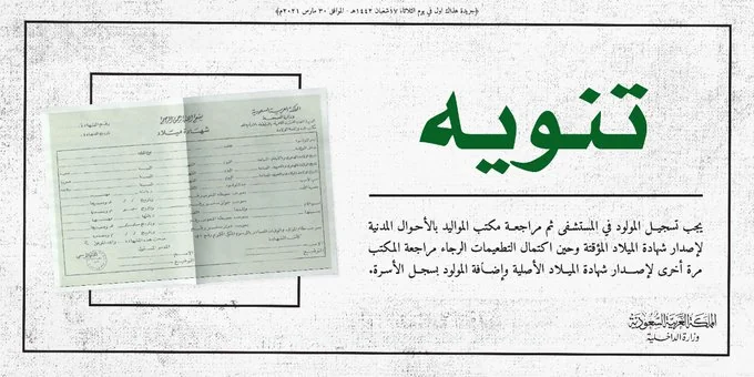 وكان من بين الإجراءات التي تم تسهيلها أيضاً تسجيل المواليد حيث كا يجب التسجيل في المستشفى ثم مراجعة مكتب المواليد وبعد اكتمال التطعيمات يتم إصدار الشهادة وغيرها من الإجراءات في عدة جهات تم تيسييرها واستلام التقدم الإلكتروني.