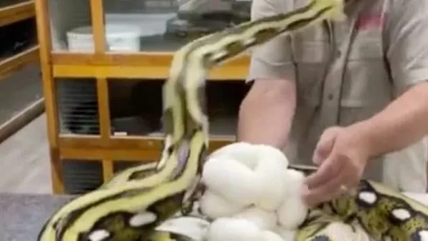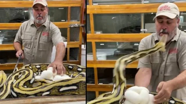ثعبان ضخم يعض وجه حارس حديقة حيوان
