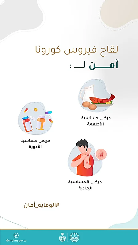 وأكدت إدارة الخدمات الطبية في إنفوجرافيك توعوي ، أن لقاح كورونا آمن لثلاث أنواع من الحساسية وهي :