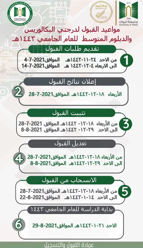 أما الإنسحاب من القبول فهو من الأربعاء 18/12/1442هـ إلى الأحد الموافق 14/1/1443 هـ، ويبدأ العام الدراسي الجامعي 1443 في يوم الأحد الموافق 21/1/1443 هـ الموافق 19/8/2021 م.