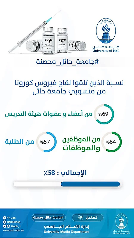 أكدت جامعة حائل أن “التحصين” بالحصول على اللقاح المضاد لفيروس كورونا، أو الشفاء من إصابة سابقة، شرط لدخول مرافق الجامعة، ابتداءً من تاريح 22 ذي الحجة 1442هـ.