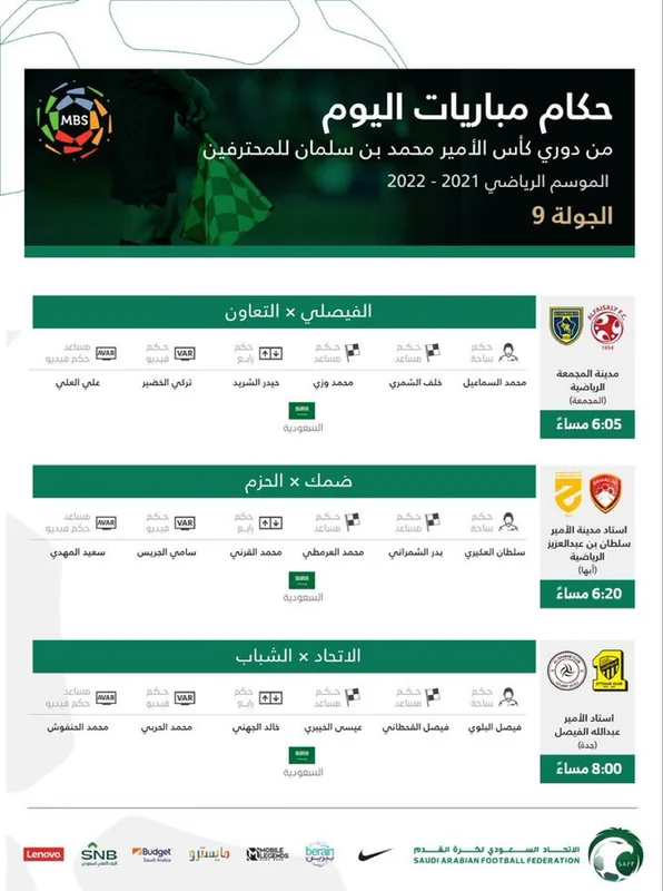 ويقود مباراة الفيصلي والتعاون: حكم ساحة: محمد السماعيل، وحكم “VAR”: تركي الخضير، في حين يقود مباراة ضمك والحزم، حكم ساحة: سلطان العكيري، وحكم “VAR”: سامي الجريس