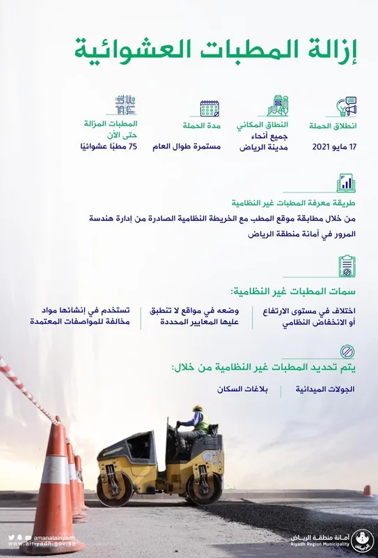 يذكر أن حملة إزالة المطبات غير النظامية تأتي متماشية مع البرامج والمشاريع التي تنفذها أمانة منطقة الرياض بهدف تطوير الطرق، واستدامتها، بما يسهم في تحقيق مستهدفات سهولة التنقل داخل المدينة، ورفع مستوى السلامة المرورية فيها، حفاظًا على سلامة سالكيها وراحتهم.