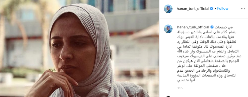 ونشرت حنان ترك صورة حديثة لها ، مؤكدة أنها تقدمت ببلاغ لإدارة فيسبوك لوقف الحساب الوهمي الذي روج لشائعة تزعم عودتها للتمثيل .