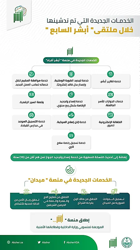 شهد ملتقى أبشر السابع تدشين ضمن خدمات جديدة، وذلك ضمن جهود وزارة الداخلية في أتمتة خدمات قطاعاتها.
