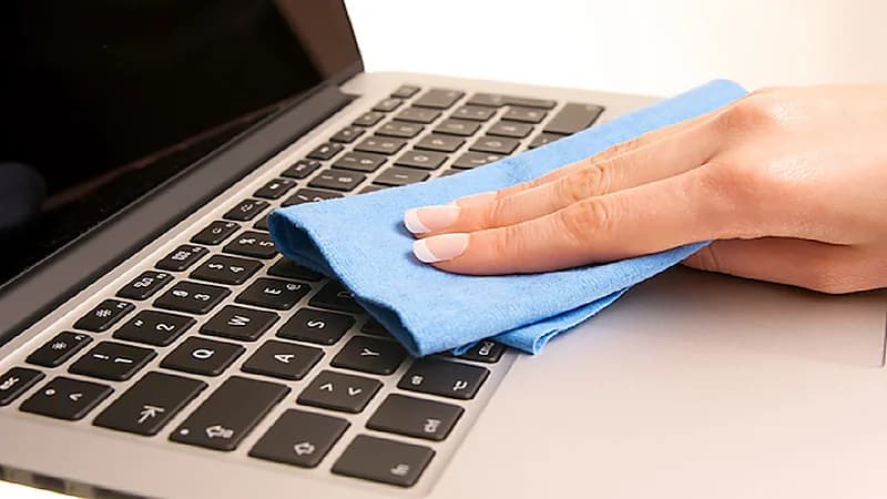 ويمكن تنظيف اللابتوب باستخدام أدوات يسيرة، تتمثل في قطعة قطن وقطعة قماش من الألياف الدقيقة وعلبة هواء مضغوط (بخاخ تنظيف)، وحوالي 90٪ -100٪ كحول الأيزوبروبيل.