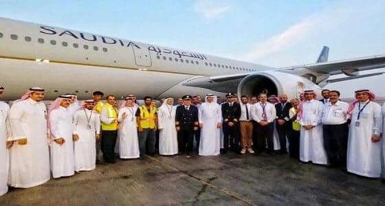 وفور توقف الطائرة، صعد إليها مدير عام الخطوط السعودية والمشاركون في الاستقبال، حيث رحب بهم قائد الطائرة الكابتن إسماعيل بخاري ومساعده الكابتن رامي الخربوش.