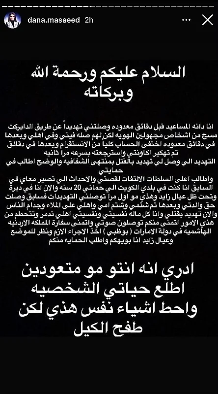 وقالت "دانة" من خلال خاصية الأستوري: "أنا دانه المساعيد أردنية الجنسية كويتية الأم أتعرض لتهديدات بالقتل بكل شفافية علنية من أسرة الأب وسبق واخذني والدي من أمي ورجعتني أمي قانونيًا لها وبعد ذلك ما تركوني ولا لحظه أعيش بسلام أطالب من أعلى السلطات بحمياتي لا تجعلوني الضحية القادمة وصلوا صوتي لكل مكان".