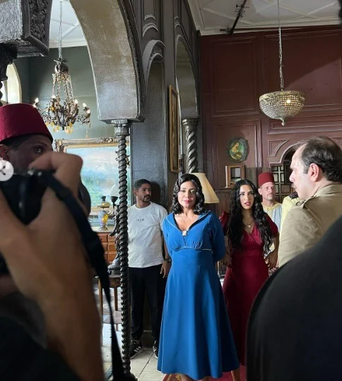 وظهرت الفنانة وهي ترتدي ملابس قديمة وتقف داخل الاستديو الذي تدار فيه أحداث مسلسها الجديد.