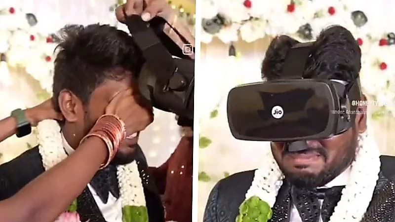 وأظهر مقطع مصور، العريس وهو يرتدي نظارة الواقع الافتراضي خلال حفل زفافه، ليظهر والده وكأنه حاضر بين المدعوين للحفل.
