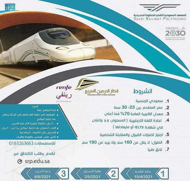أعلن المعهد السعودي التقني للخطوط الحديدية "سرب" عن فتح باب التسجيل للتدريب في برنامج "قائد قطار الحرمين السريع"، الذي يستمر لمدة عام وينتهي بالعمل في شركة رينفي - السعودية، أحد الشركات المتحالفة لتشغيل مشروع قطار الحرمين السريع.