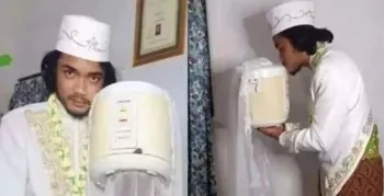 أثار شاب إندونيسي يٌدعى "خوارول أنام" الجدل بإعلان زواجه من قدر ضغط ونشره صور تجمعهما.