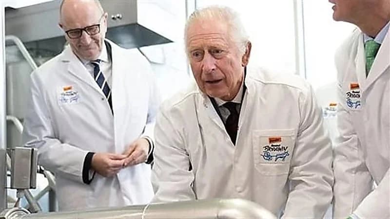 ودخل الملك تشارلز الثالث في نوبة ضحك عندما تم إقناعه بارتداء معطف وأحذية بلاستيكية للانضمام إلى العاملين في مصنع الألبان.