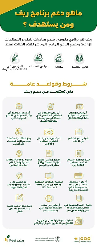 وأضاف البرنامج أن شروط الاستفادة من برنامج ريف هي أن يكون المتقدم سعودي الجنسية وحاملات لبطاقة التنقل ،أن يكون المتقدم من ممتهني أحد المهن الذي حددها البرنامج ومباشرا لمهامها بنفسه ،ألا يشغل المتقدم أي وظيفة في القطاع العام أو الخاص ،ألا يقل عمر المتقدم عن 21 سنة ، ألا يتجاوز الدخل الشهري للمتقدم 9000 رأس ، يحق للمتقدم الاستفادة من دعم ثلاث قطاعات لحد أقصى .