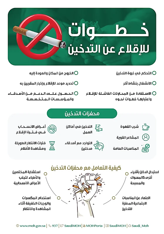 وأوضحت "صحة الرياض" عبر "إنفوجرافيك" توعوي أنه يمكن الإقلاع عن التدخين عبر خطوات بسيطة تشمل: التحكم في ذروة التدخين، الإنشغال بنشاط آخر، الاستفادة من المحاولات الفاشلة للإقلاع واعتبارها خطوات نحو الإقلاع عن هذه العادة السيئة، الخروج من المكان والعودة إليه، إضافة إلى تحديد موعد للإقلاع وإخبار المقربين به، والحصول على الدعم من الأصدقاء والمؤسسات المتخصصة.