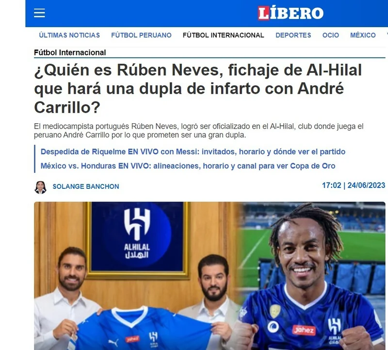 أشادت صحيفة بيروفية بإنهاء إجراءات التعاقد مع النجم البرتغالي روبن نيفيز، قادمًا من صفوف وولفرهامبتون الإنجليزي.