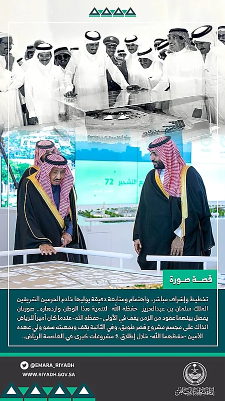 نشرت إمارة منطقة الرياض صورتين يفصل بينهما عقود من الزمن لخادم الحرمين الملك سلمان بن عبد العزيز أثناء متابعته للمشاريع التنموية في الرياض