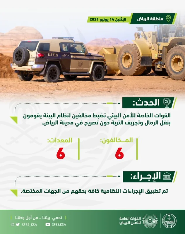 ضبطت القوات الخاصة للأمن البيئي (6) مخالفين لنظام البيئة يقومون بنقل الرمال وتجريف التربة دون تصريح في مدينة الرياض.
