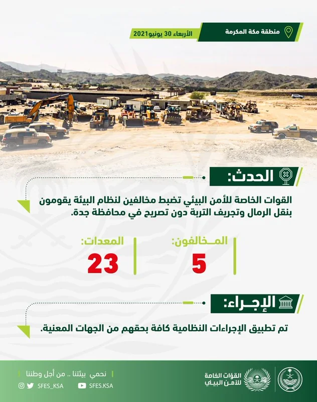 وأوضح المتحدث الرسمي للقوات الخاصة للأمن البيئي الرائد / رائد المالكي، أنه تم ضبط 23 آلية تستخدم في نقل الرمال وتجريف التربة، تعود ملكياتها لمواطنَين، ويعمل عليها مقيمون من الجنسيتين اليمنية والباكستانية وتم تطبيق الإجراءات النظامية كافة بحقهم من الجهات المختصة.
