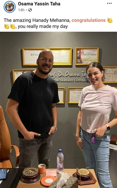 من جانبه، نشر طبيب جراحة السمنة والتجميل أسامة ياسين، صورة تجمعه بـ"هنادي"، عبر حسابه على موقع "فيس بوك"، وعلق عليها بقوله: "هنادي مهنا المذهلة.. مبروك لقد أسعدتيني حقًا"، ليزيل الغموض حول سر نحافتها، ويؤكد إلى حد كبير، أن السبب هو خضوعها لعملية جراحية، على يده.
