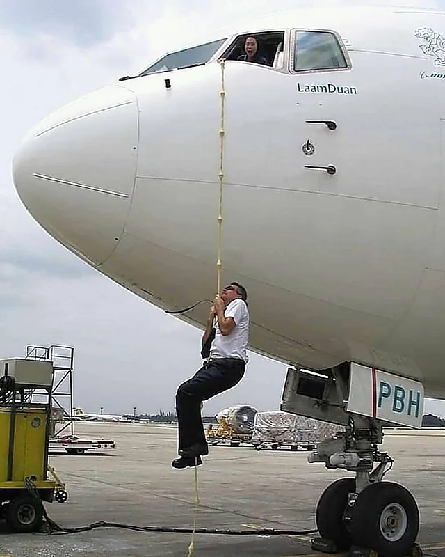 ونشر الكابتن الطيار علي الجاسر الصورة الطريفة التي تظهر الطيار متدليًا من شباك الطائرة الأمامي بواسطة حبال، حيث تساءل ساخرًا: "هذا طالع وإلا نازل وليش؟ ".