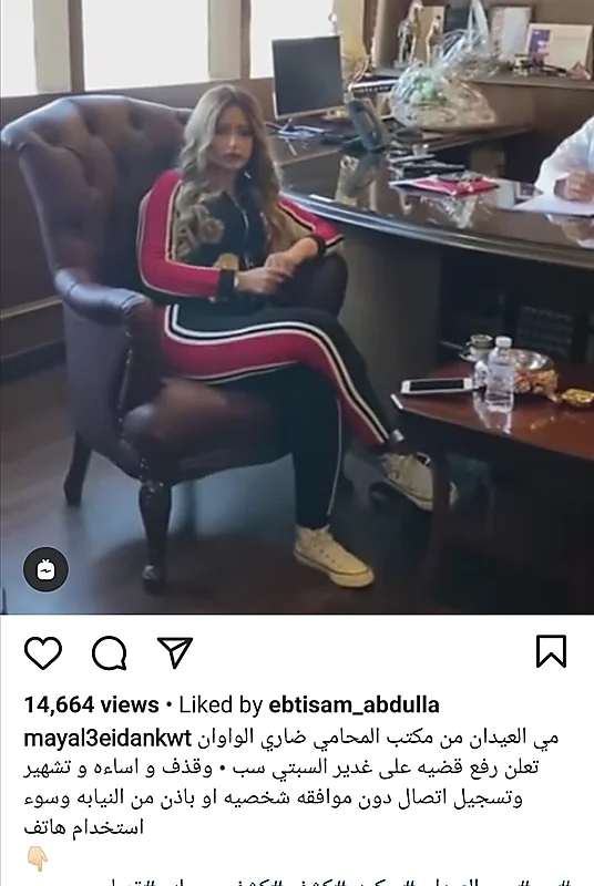 ونشرت العيدان صورتها من داخل مكتب المحامي الخاص بها، معلقة :"مي العيدان من مكتب المحامي ضاري الواوان تعلن رفع قضيه على غدير السبتي سب وقذف و اساءه و تشهير وتسجيل اتصال دون موافقه شخصيه او باذن من النيابه وسوء استخدام هاتف".