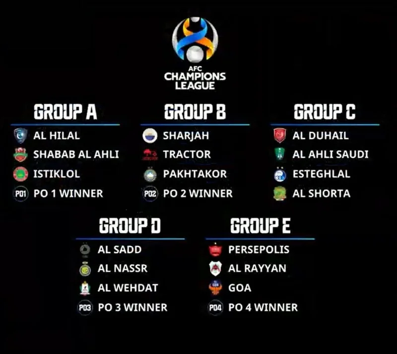 وجاء الهلال في المجموعة الأولى ليواجه شباب أهلي دبي نادي استقلول الطاجيكي، فيما جاء النصر في المجموعة الرابعة ليواجه السد القطري والوحدات الأردني.