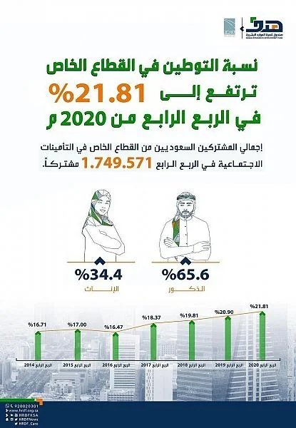 كشف المرصد الوطني للعمل التابع لصندوق تنمية الموارد البشرية "هدف"، عن ارتفاع معدل التوطين في منشآت القطاع الخاص خلال الربع الرابع من العام الماضي 2020 إلى 21.81% من إجمالي العاملين في القطاع الخاص، مقارنة بـ 20.90% من الربع نفسه من 2019، و19.81% في 2018، و18.37% في 2017، و16.47% في 2016، و17% في 2015م.