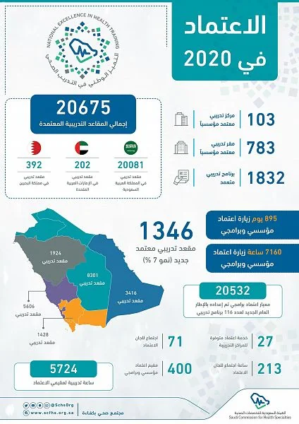 كشفت الهيئة السعودية للتخصصات الصحية، أن عدد المراكز التدريبية المعتمدة مؤسسياً خلال العام الماضي 2020م بلغ نحو 103 مراكز تدريبية تضمنت 783 مقراً تدريبياً، فيما وصل عدد البرامج التدريبية المعتمدة إلى 1832 برنامجاً تدريبياً.