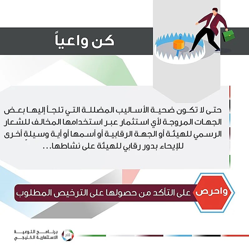 كما نبهت هيئة السوق المالية على ضرورة الوعي حتى لا يقع المواطن أو المقيم ضحية الأساليب المضللة التي يلجأ إليها بعض الجهات المروجة لأي استثمار عبر استخدامها المخالف للشعار الرسمي للهيئة أو الجهة الرقابية أو اسمها أو اية وسيلة أخرى للإيحاء بدور رقابي للهيئة على نشاطها .
