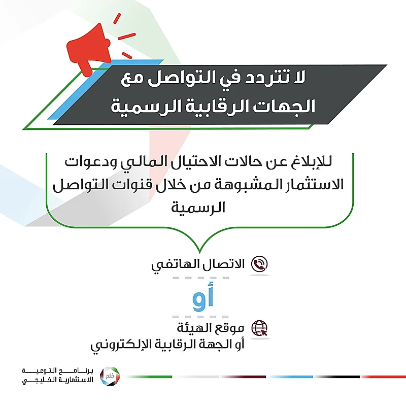 دعت هيئة السوق المالية اليوم الأحد للإبلاغ عن حالات الإحتيال ودعوات الإستثمار المشبوهة من خلال قنوات التواصل الرسمية .