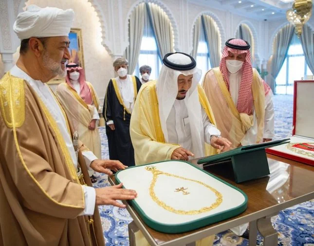 قدّم خادم الحرمين الشريفين الملك سلمان بن عبدالعزيز آل سعود ـ حفظه الله ـ، قلادة الملك عبدالعزيز تقديراً لصاحب الجلالة السلطان هيثم بن طارق، سُلطان عُمان.