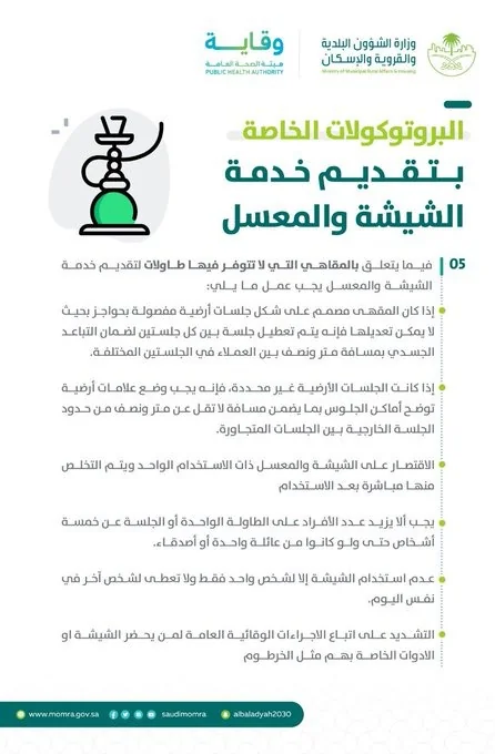 أعلنت وزارة الشؤون البلدية والقروية والإسكان البروتوكولات الوقائية التي تم اعتمادها من هيئة الصحة العامة (وقاية) في مقاهي تقديم الشيشة، وذلك لمنع تفشي عدوى فيروس كورونا المستجد «كوفيد-19».